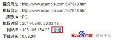 抓取诊断工具会检查站点与百度的连接是否畅通,若站长发现IP信息还是老旧的,可以通过“报错”通知百度搜索引擎更新IP,如下图所示: